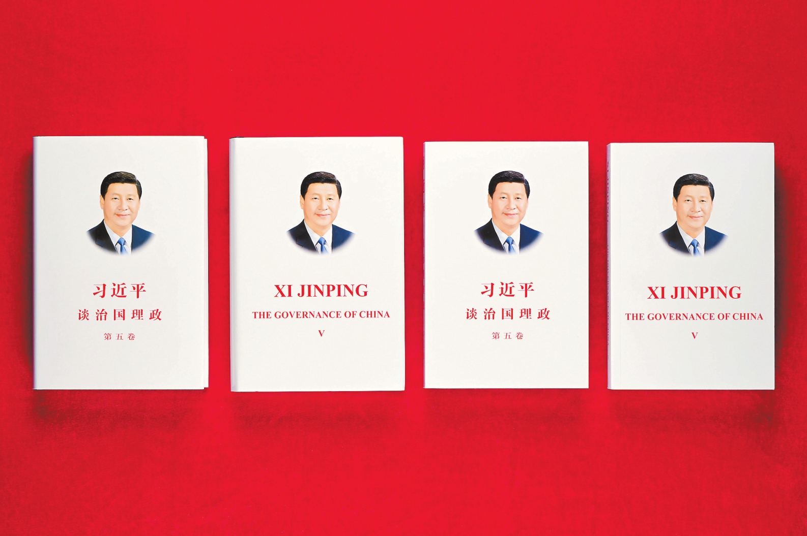 中央宣传部(国务院新闻办公室)会同中央党史和文献研究院、中国外文局编辑的《习近平谈治国理政》第五卷由外文出版社以中英文版出版,面向海内外发行。 这是《习近平谈治国理政》第五卷中英文版的精装版和平装版。 新华社记者 李贺 摄