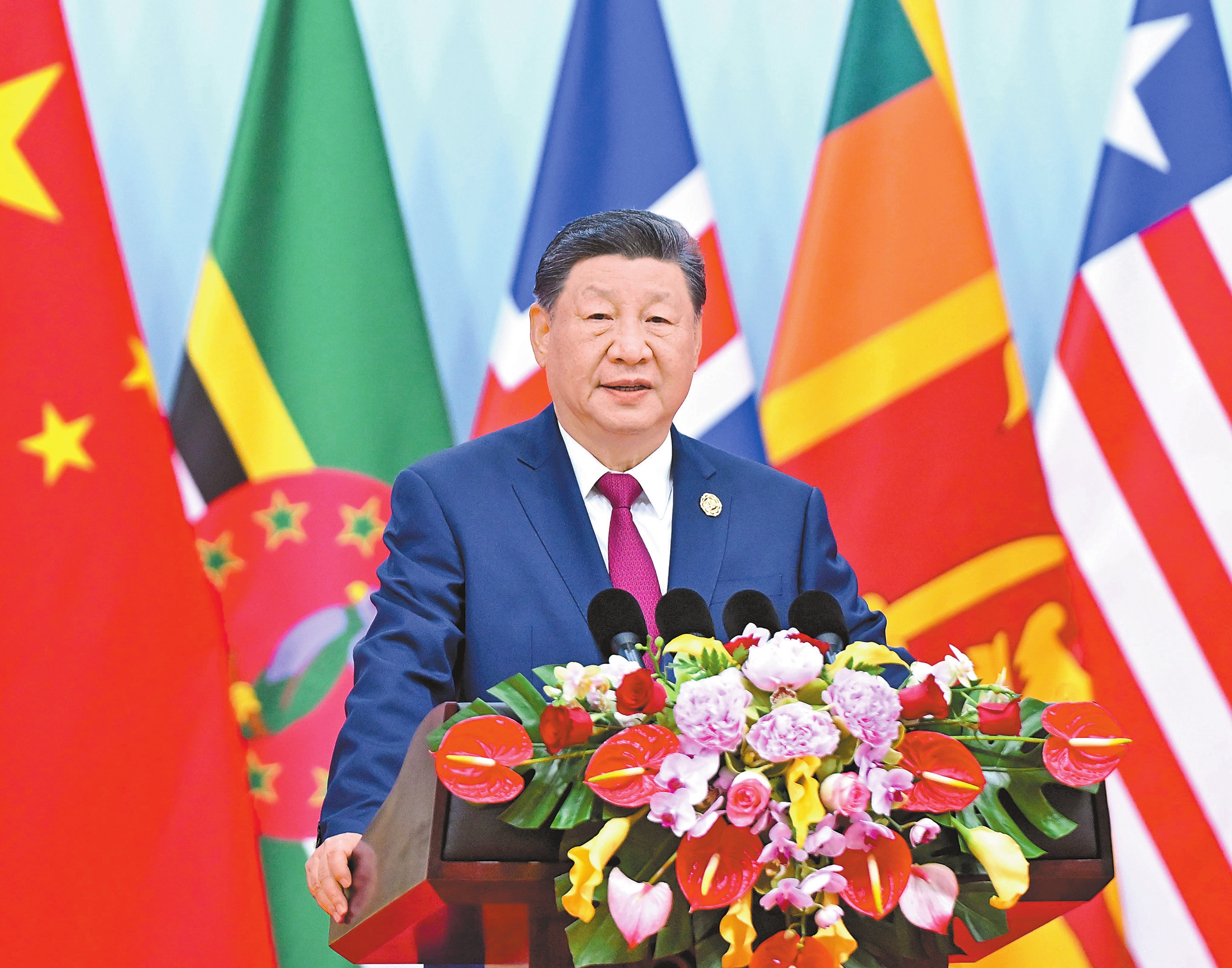 金秋时节,天朗气清。国家会议中心会场内,各国国旗和联合国旗帜组成恢弘旗阵。