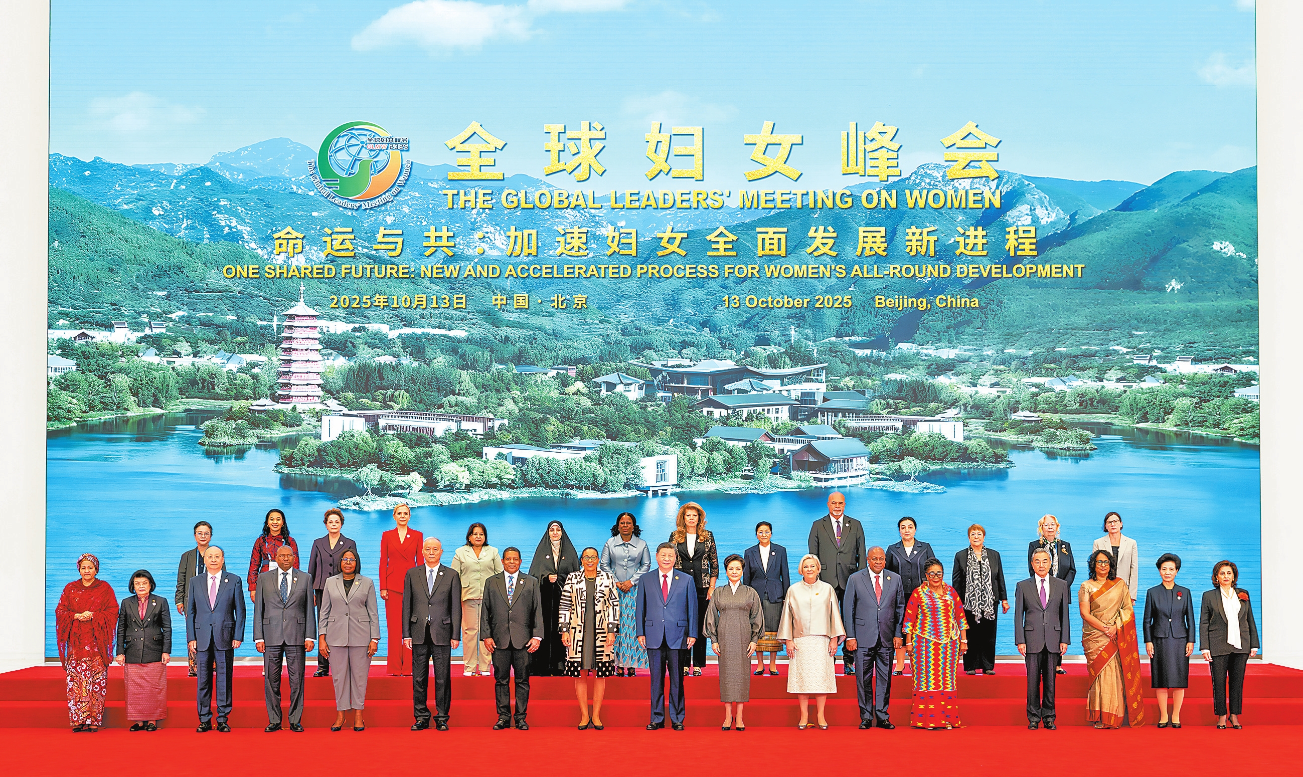 10月13日上午,国家主席习近平在北京国家会议中心出席全球妇女峰会开幕式并发表主旨讲话。这是习近平和夫人彭丽媛同与会各国和国际组织代表团团长夫妇合影留念。 新华社记者 黄敬文 摄