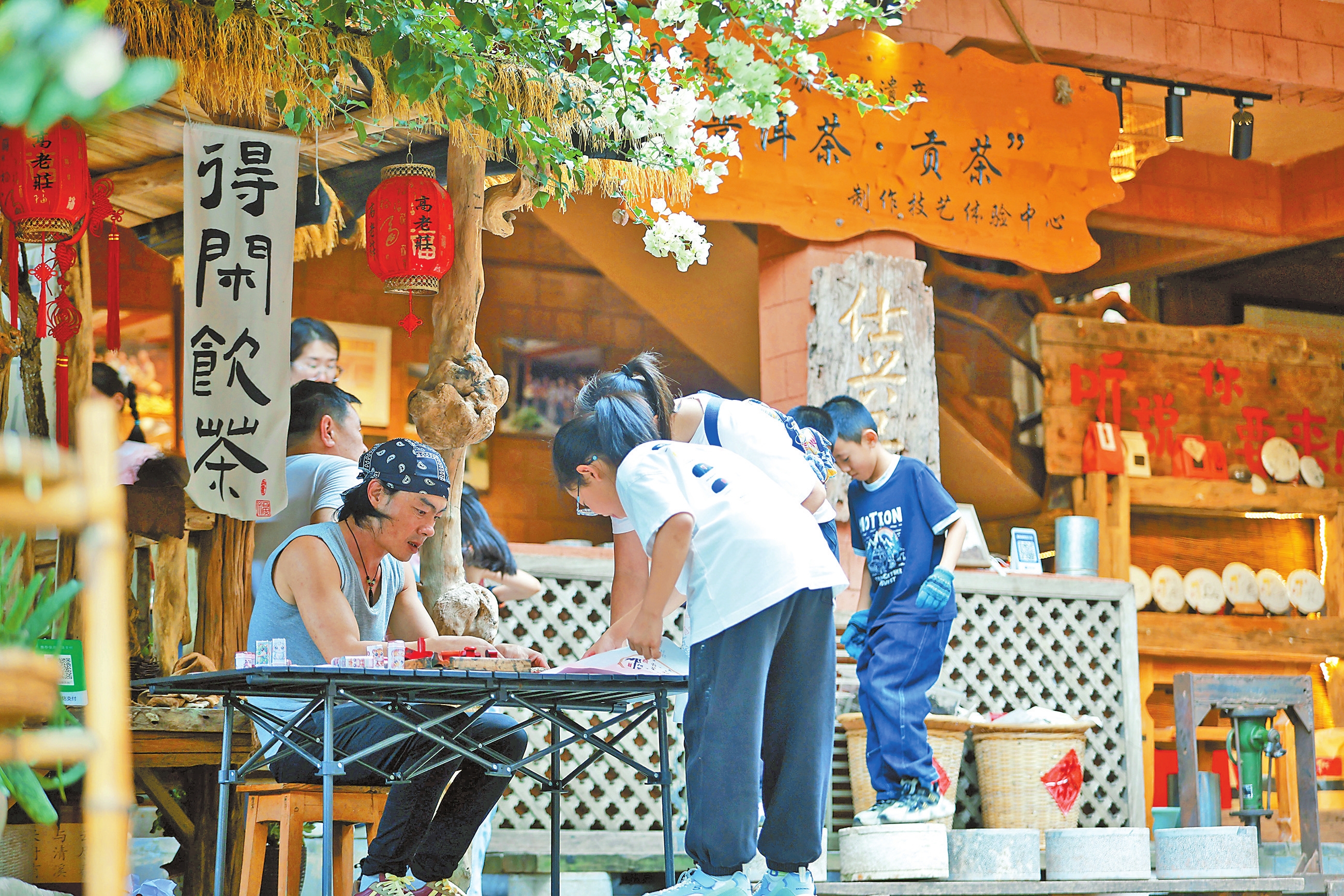 上图为古法制茶店内,孩子们正在体验制茶技艺。