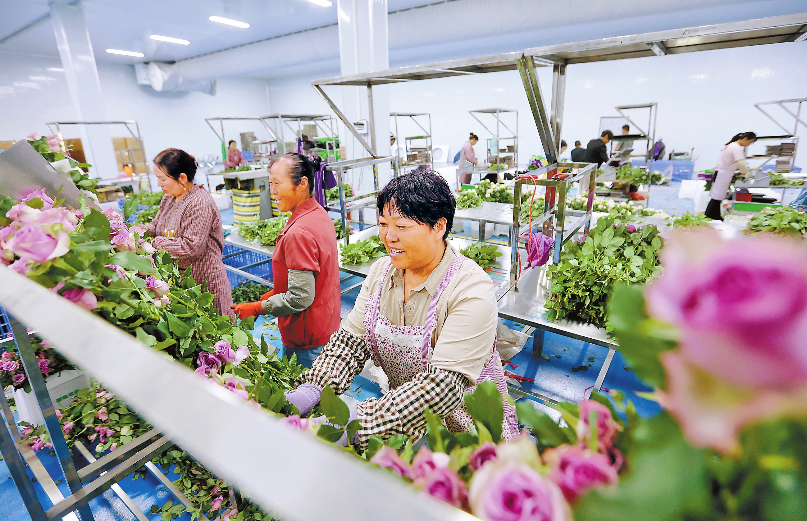 图为黎晓农业种植公司工人在分拣鲜切花。