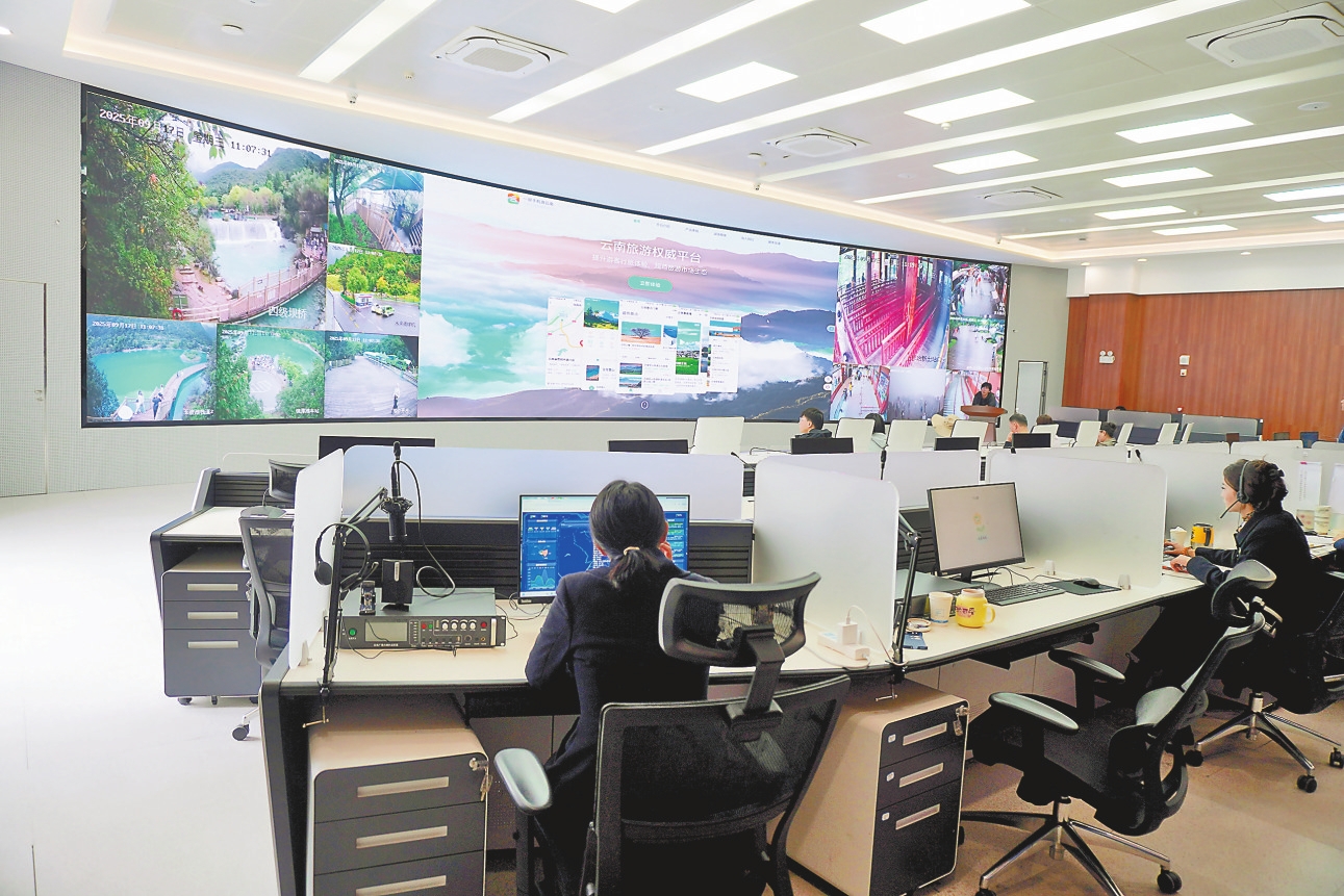 “数字化转型不仅提升了管理效率,更优化了游客体验。”玉龙雪山管委会信息中心主任蔡云亮说。在管理端,智慧平台整合客源预测、游客分布、交通调度、森林防火、环境监测等实时数据,指挥中心大屏可直观呈现景区综合态势,为科学决策和应急处理提供有力支撑。在服务端,景区深度对接“一部手机游云南”平台,游客通过手机就能完成行程查询、直播观景、购票入园、智能导览、投诉咨询等全流程服务。此外,景区还创新打造“1+N”模式智慧运营管理系统,实现票务、资金、数据的闭环管理。“财务数据实时可控,运营成本显著降低,资源整合能力大幅提升。”蔡云亮补充道。