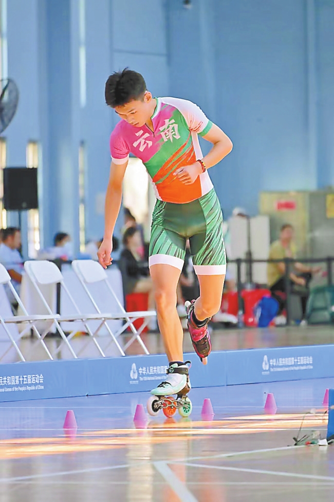 本报讯(记者 尹朝平 周灿) 10月15日至19日,第十五届全国运动会群众比赛轮滑项目决赛在广东惠州举行。云南省轮滑代表队运动员李佳瑞在轮滑自由式速度过桩项目中夺得金牌。