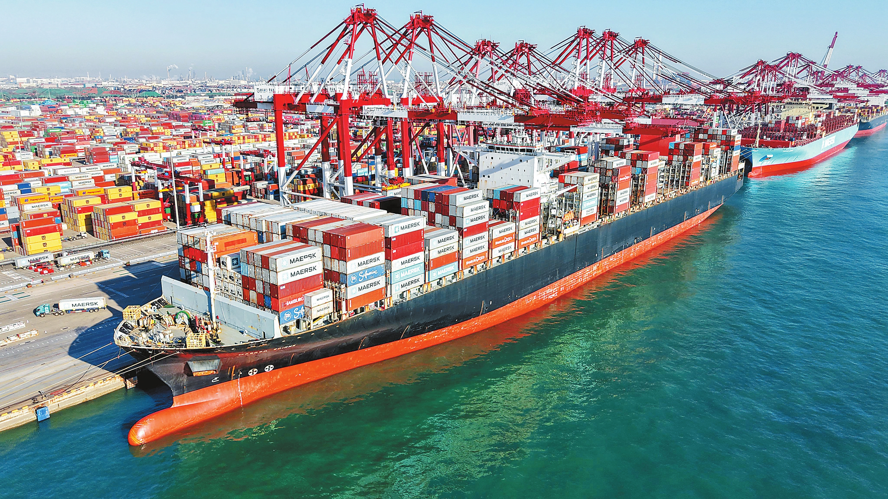 海关总署12月8日发布数据:今年11月份,我国货物贸易进出口3.9万亿元,同比增速回升至4.1%,从2月起连续10个月保持同比增长。图为2月8日,货轮在山东港口青岛前湾港装卸外贸集装箱(无人机照片)。 新华社发 俞方平 摄