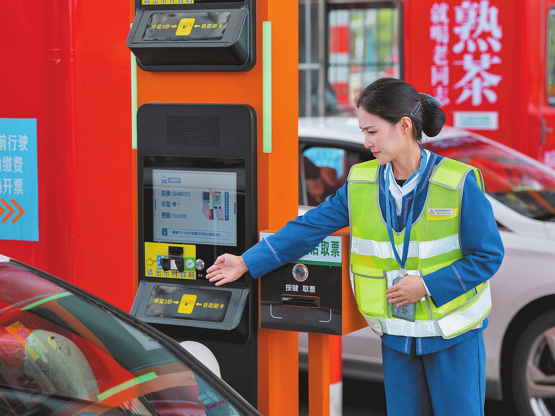 近日,昆明机场高速公路顺利完成数字化电子发票系统部署工作,成为我省首条全面完成数电发票升级的高速公路。图为昆明机场高速公路李其收费站收费员引导驾乘人员使用收费机器人缴费开票。本报通讯员 郭浪栈 潘云 摄