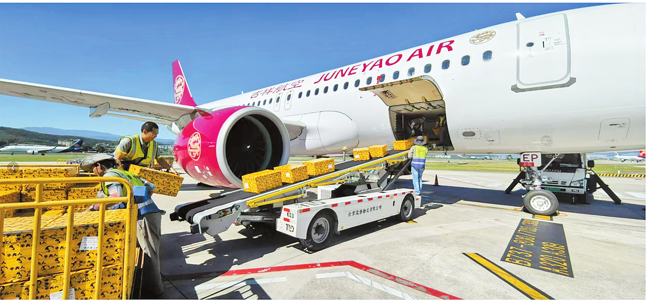 西双版纳机场充分利用昆明枢纽通达全国优势,持续提高经昆中转货运量和装载能力。2025年,机场单日货邮量突破141吨,创历史新高。本版图片均由云南航空产业投资集团提供