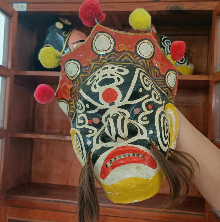 每一个面具都是角色性格的视觉凝练——关羽面如重枣、丹凤眼;张飞蝴蝶大脸,红白黑三色交织,头顶如蹿火苗。“最难的是彩绘与描金,一笔不慎,前功尽弃。”他制作的面具不仅传神,更讲究实用:重量控制在500克左右,厚度仅约2毫米,既结实又不影响表演。