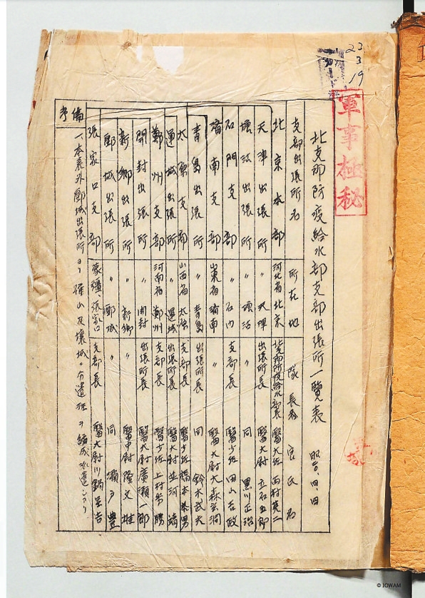 打开名簿首页,一张《北支那防疫给水部支部出张所一览表》映入眼帘。表的右上侧盖着清晰的“军事极秘”印章,表内该部队本部位于北京,下属有石门(石家庄)、济南等5个支部,天津、塘沽、青岛等7个派出机构,以及确山、壤城两个分遣班,各机构负责人的姓名、军衔等信息一应俱全。