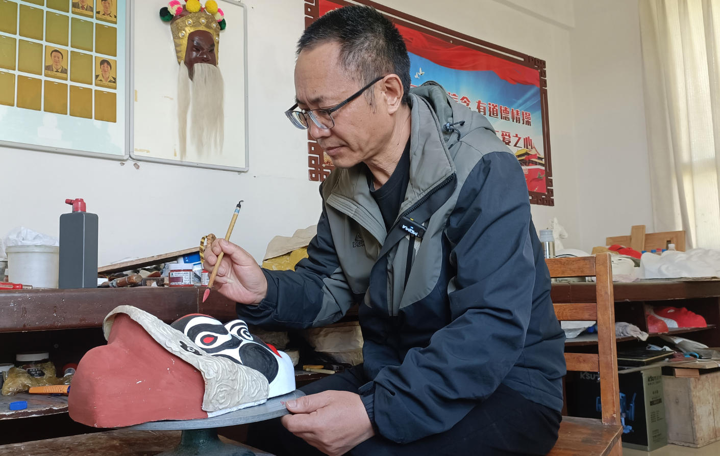 每一个面具都是角色性格的视觉凝练——关羽面如重枣、丹凤眼;张飞蝴蝶大脸,红白黑三色交织,头顶如蹿火苗。“最难的是彩绘与描金,一笔不慎,前功尽弃。”他制作的面具不仅传神,更讲究实用:重量控制在500克左右,厚度仅约2毫米,既结实又不影响表演。