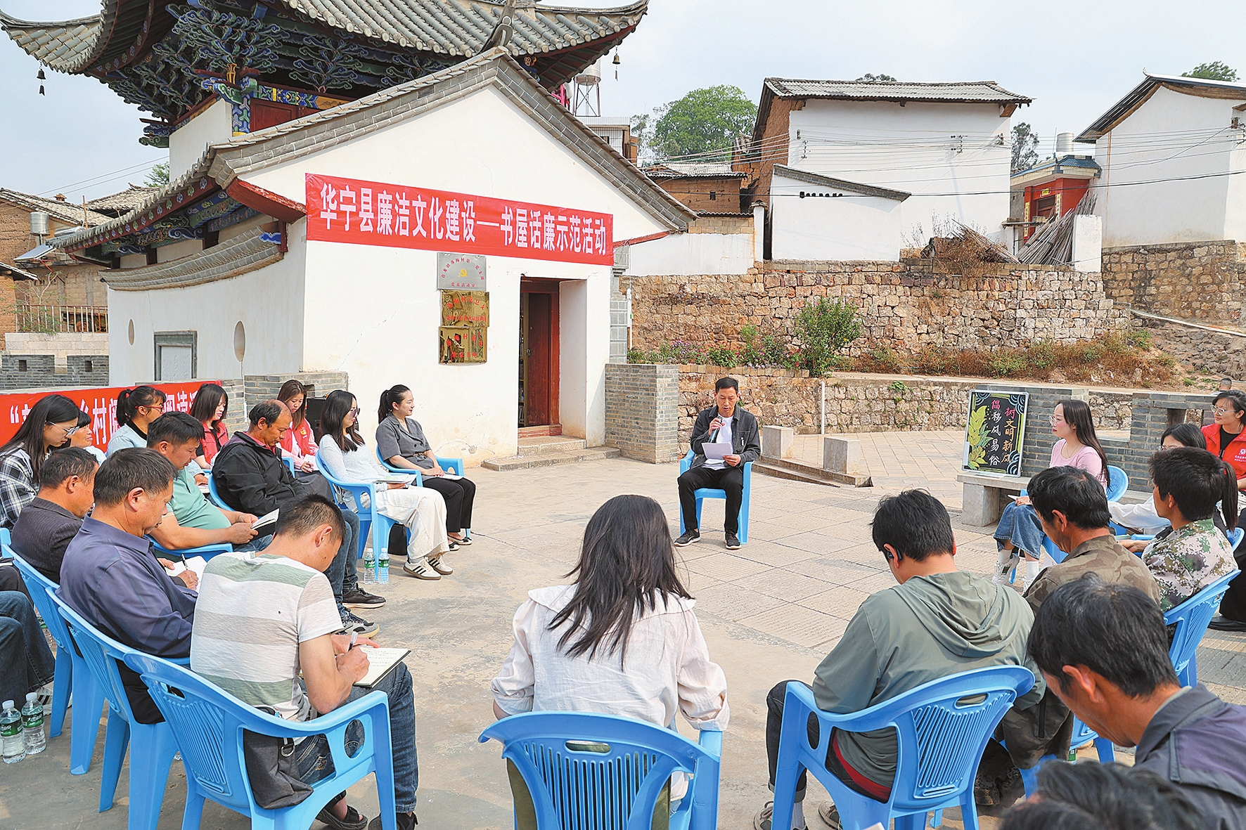 华宁县青龙镇落梅村委会来保康小组农家书屋前,19名来自该镇各村(社区)的财务负责人、村民代表围坐一堂,举行“书屋话廉”活动。大家共同学习村集体“三资”管理、读廉洁故事,既提升履职能力,又接受廉洁文化的熏陶。
