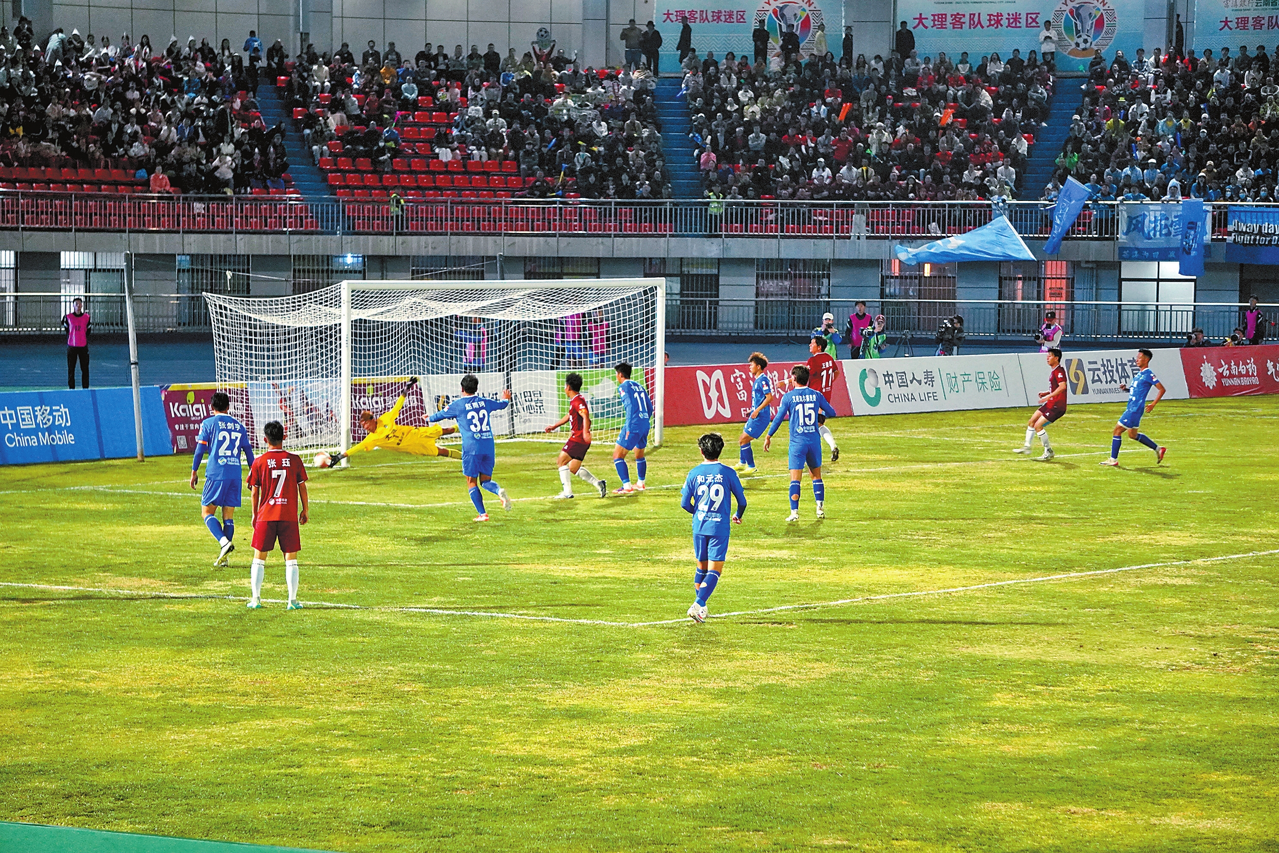 在德宏傣族景颇族自治州体育中心体育场,德宏队主场迎战丽江队。比赛伊始,德宏队对丽江队形成强烈进攻态势,随着时间的推移,丽江队控球时间占据主动,双方抢断、传球、射门精彩不断,攻防转换连连上演,球门前威胁不断,球迷喝彩声连连,几经激烈对阵,双方仍未撕破对方球门,上半场0:0结束。下半场,双方改变攻防战术,争抢十分激烈,德宏队顽强防守,丽江队奋力拼抢。比赛进行到补时阶段,丽江队继续猛攻,仍未突破球门。比赛进入到点球阶段,丽江队以4:2的比分,锁定本场比赛胜局。