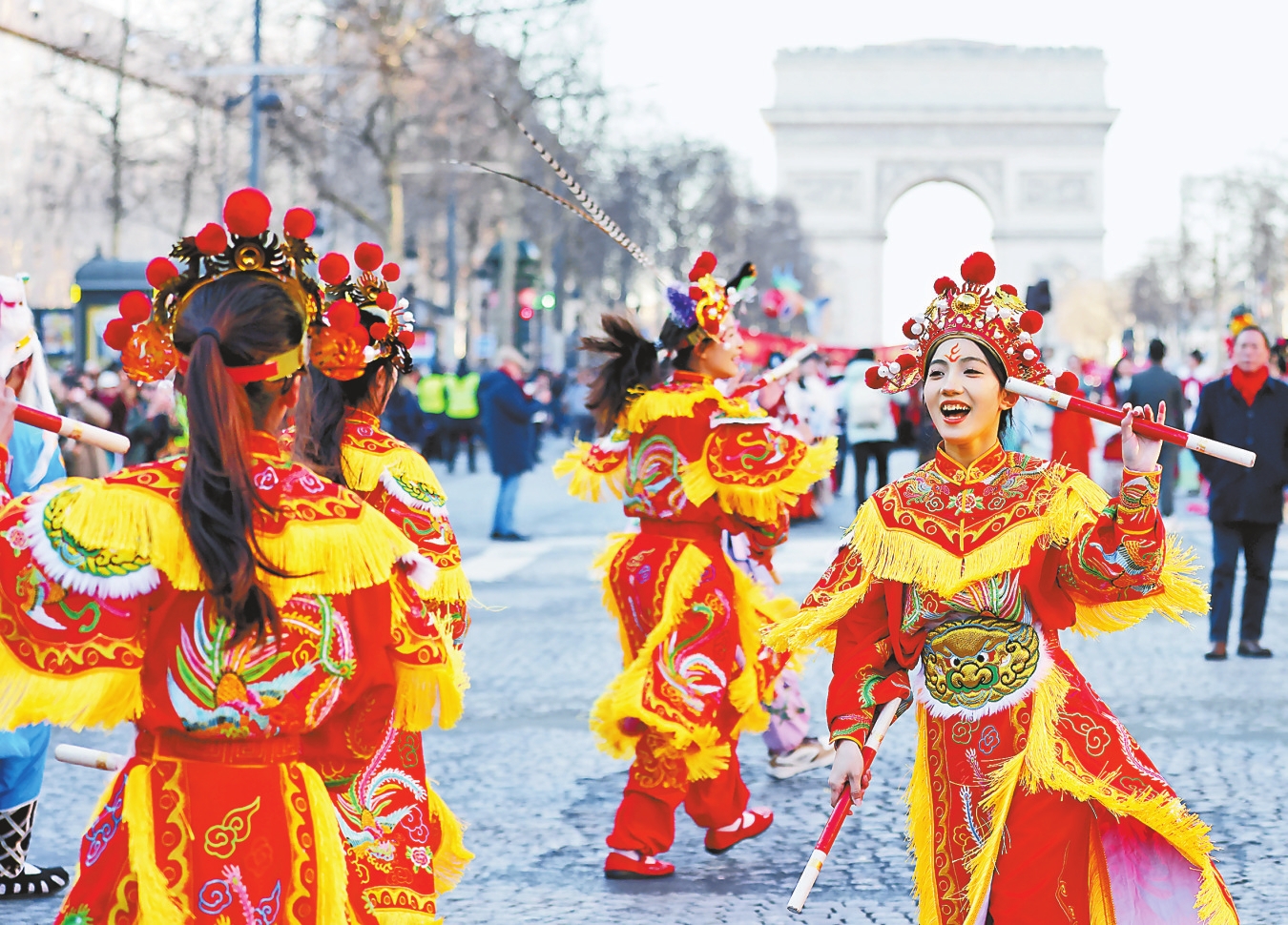 2025年2月2日,“欢乐春节满巴黎,龙狮贺岁舞香街”春节巡游活动在巴黎香榭丽舍大街举行,来自广东汕头潮阳的西门英歌队在巡游活动中亮相。 新华社记者 高静 摄