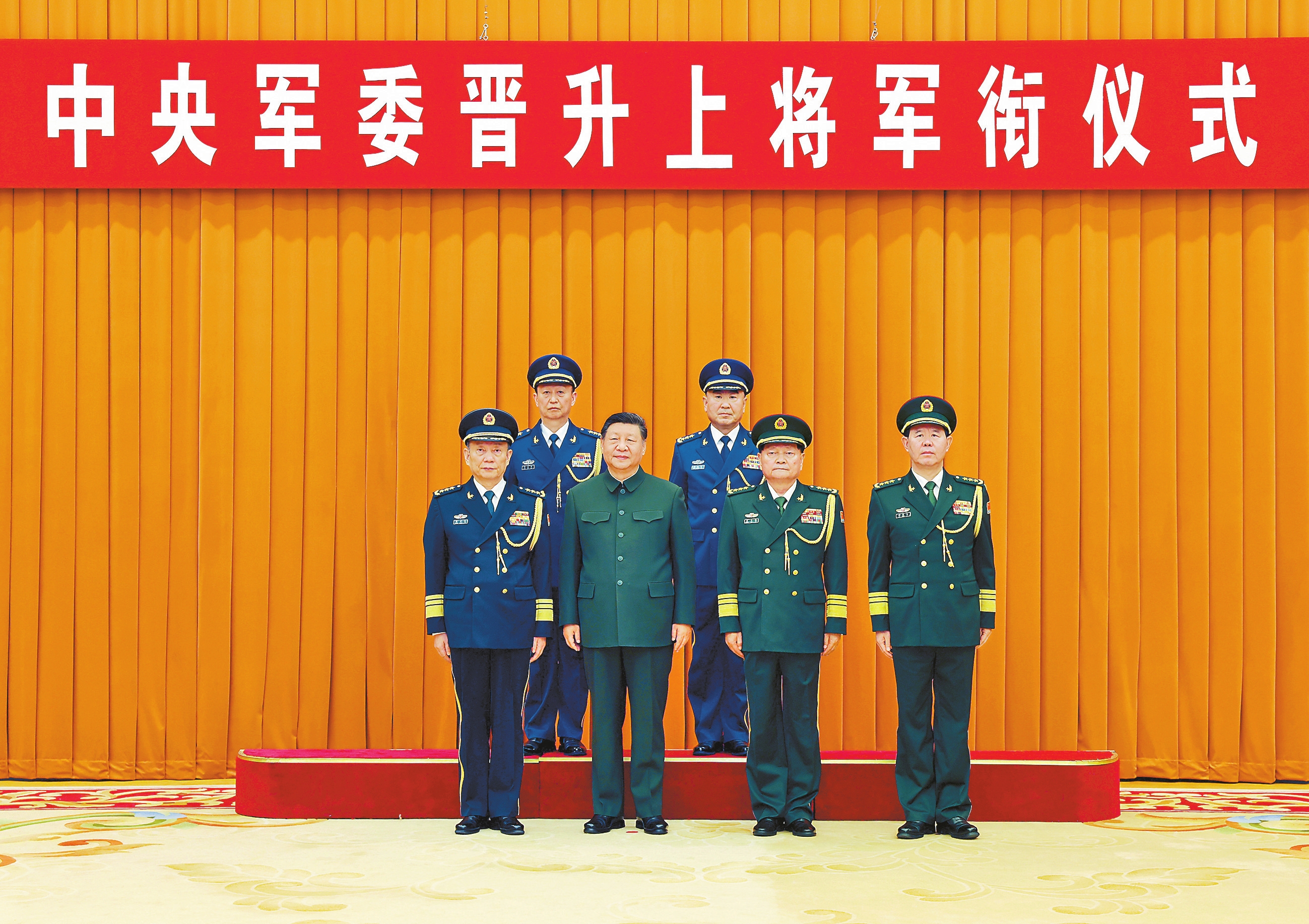 晋衔仪式在嘹亮的中国人民解放军军歌声中结束。随后,习近平等领导同志同晋升上将军衔的军官合影。