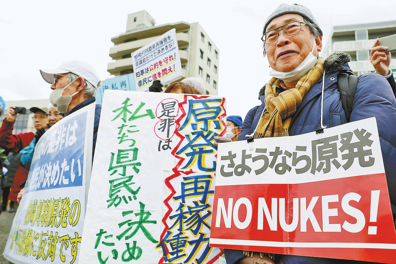 据日本共同社报道,日本新潟县议会22日批准了有关补充预算,将重启柏崎刈羽核电站。柏崎刈羽核电站位于日本新潟县,因跨柏崎和刈羽两地而得名,其总装机容量约821.2万千瓦,是日本最大的核电站。2011年“3·11”东日本大地震引发福岛第一核电站事故后,日本境内的核电机组一度全部停运,柏崎刈羽核电站也于2012年关闭。图为12月22日,民众在日本新潟县抗议重启柏崎刈羽核电站。 新华社/共同社