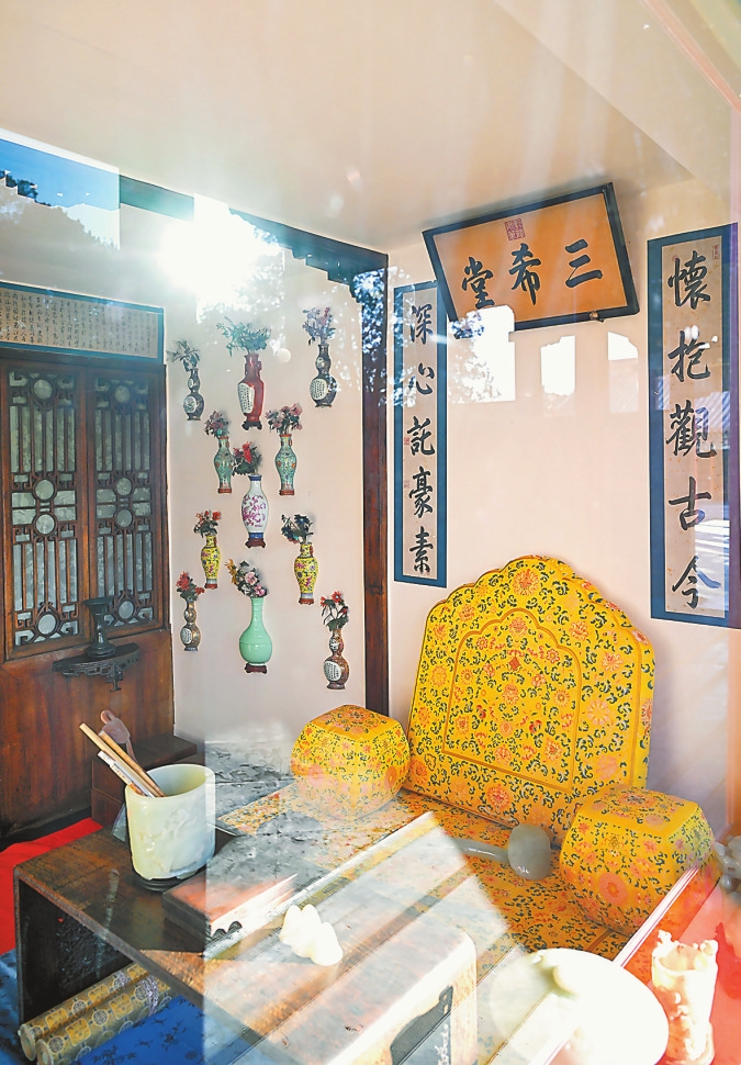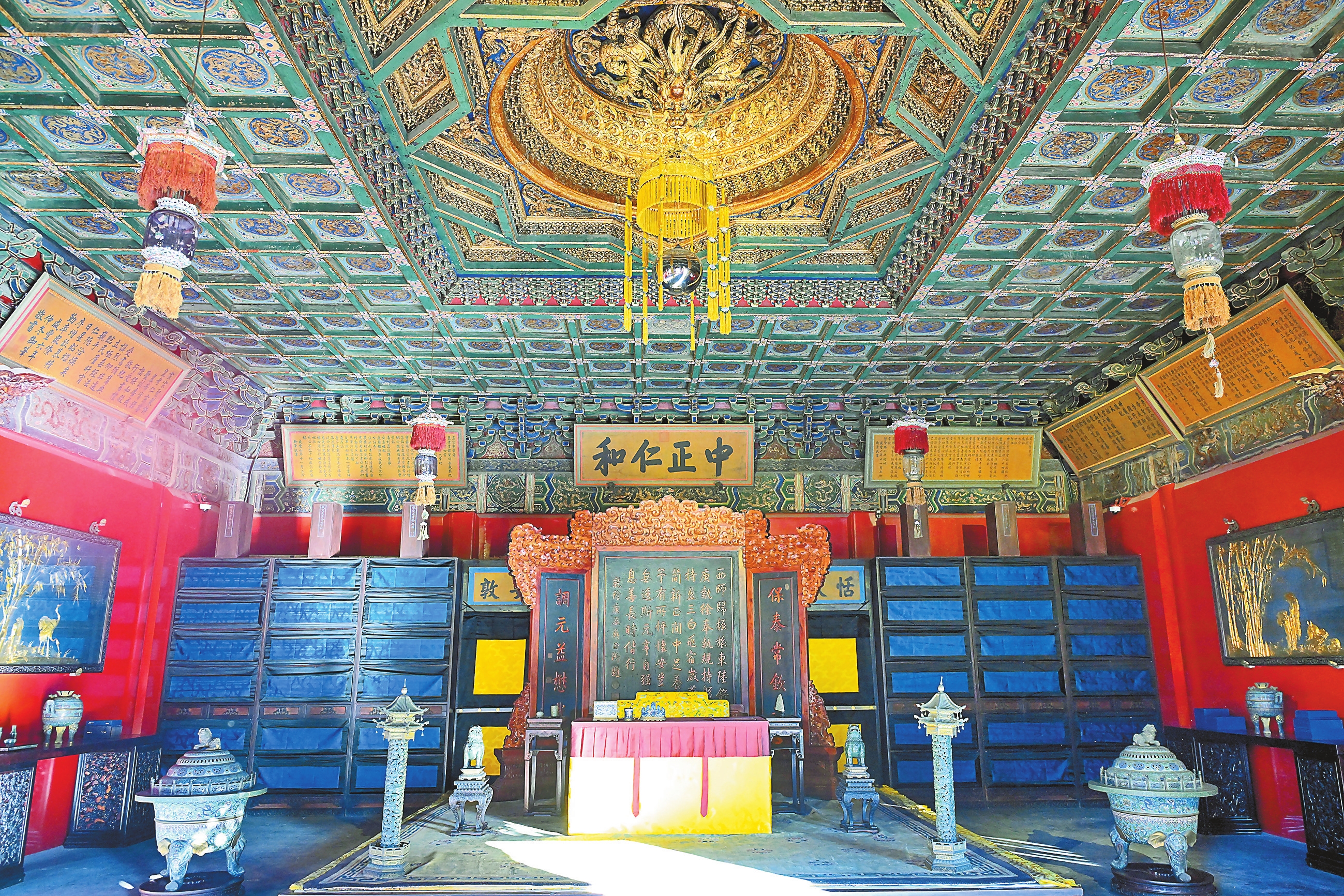 原状陈列遵循历史原貌。养心殿室内正殿宝座上方悬挂雍正御笔“中正仁和”匾,西暖阁“勤政亲贤”匾额下的楹联恢复如初,三希堂内则按记载还原了乾隆时期的陈列场景。