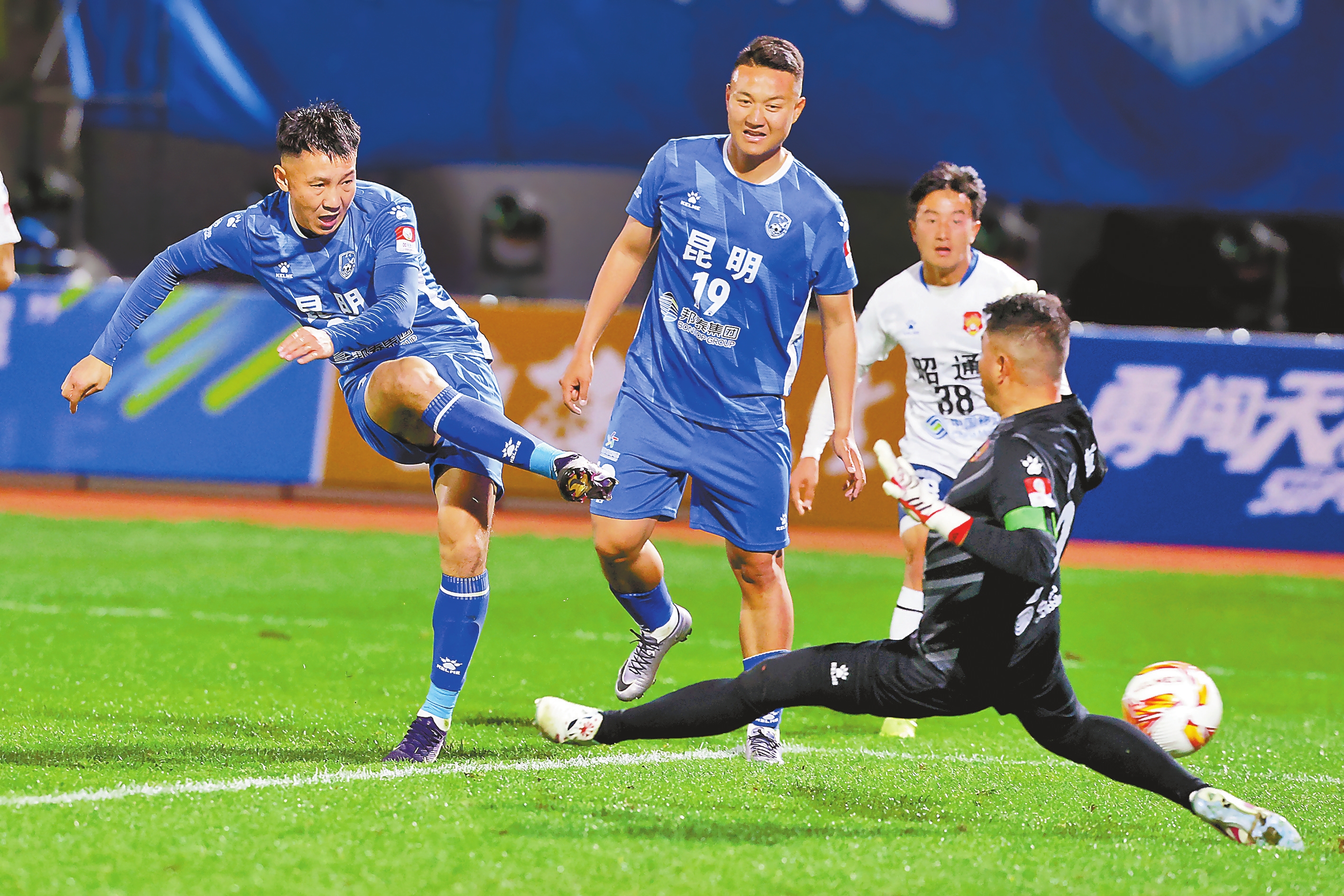12月27日,“滇超”联赛第二轮比赛继续进行。4场比赛中,昆明队4:0战胜昭通队,获得主场首胜;同样捍卫主场胜利的还有西双版纳队,他们以2:1战胜远道而来的迪庆队;楚雄队在主场3:2险胜玉溪队,爆出冷门;保山队客场挑战怒江队,最终以2:1的比分带走胜利。图为昆明队28号张天晗为昆明队打入第二球。本报记者 周灿 摄