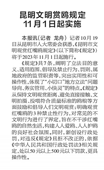 立法 2023年10月20日《云南日报》第4版,报道了昆明文明赏鸥规定于2023年11月1日起实施。