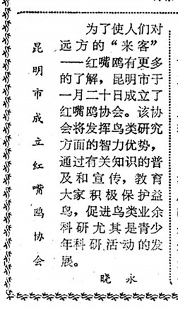 红嘴鸥协会 1987年1月22日《云南日报》1版,报道了昆明市成立红嘴鸥协会的消息。协会的成立将发挥鸟类研究方面的智力优势,促进鸟类保护与科普教育工作的系统化开展。