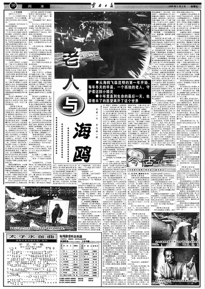 海鸥老人 1999年2月5日《云南日报》10版,整版报道了“海鸥老人”吴庆恒与红嘴鸥的一世情缘。
