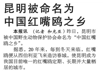 中国红嘴鸥之乡 2005年12月27日《云南日报》1版,报道了昆明市被中国野生动物保护协会命名为“中国红嘴鸥之乡”的消息。