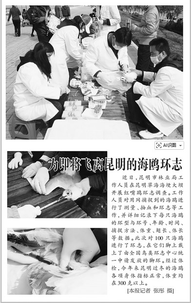 环志 2012年3月1日《云南日报》11版,报道了工作人员为即将飞离昆明的100只海鸥环志。环志工作旨在标记个体海鸥,追踪其迁徙路线、停留地点及生存状况。