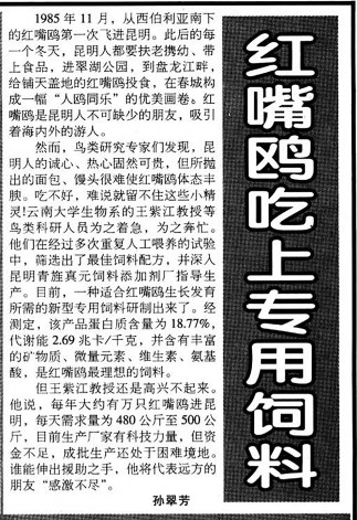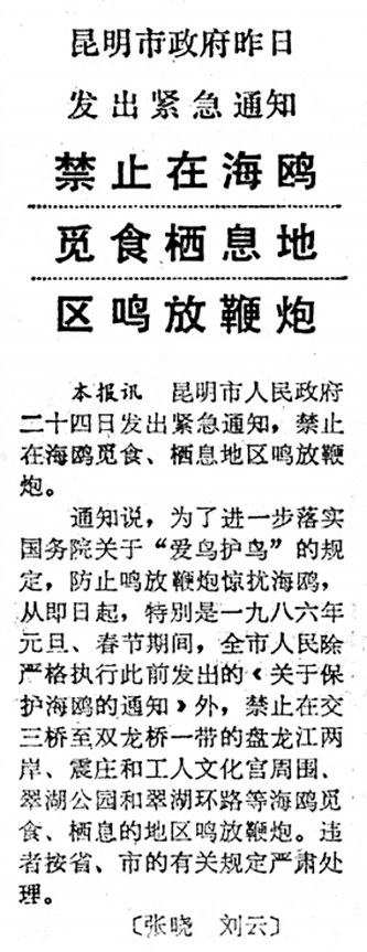 又见 1986年11月13日《云南日报》1版,刊发了红嘴鸥再次光临昆明的消息。