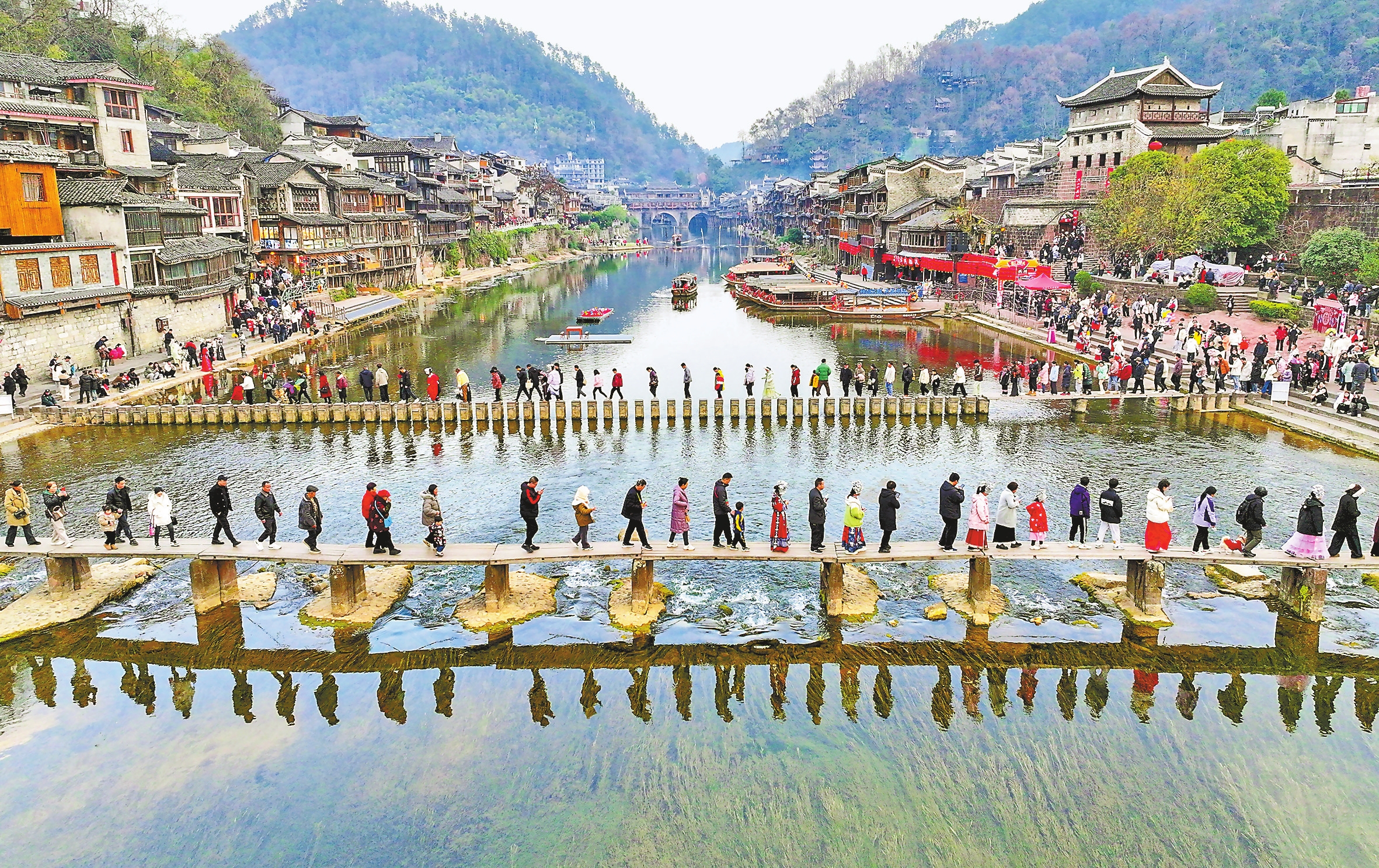 1月29日,游客在湖南省湘西土家族苗族自治州凤凰古城游玩。 新华社发 周秀鱼春 摄