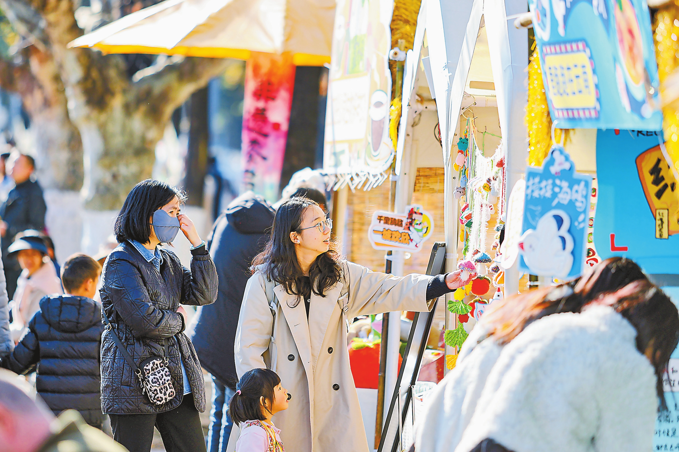 近日,2025“哇·鸥”文化艺术季在昆明大观河畔启幕。本次艺术季以“候鸟奇缘·跨越山海四十年”为主题,纪念红嘴鸥到访昆明四十周年。市集上,红嘴鸥文创、非遗手作与咖啡香气交融;河岸边,交响、钢琴、说唱等艺术形式共鸣,共绘一场流动的冬日盛宴,市民游客沉浸于艺术与生态交织的场景,尽享悠闲时光。图为市集上文创产品备受青睐。本报记者 胡妤雅 摄