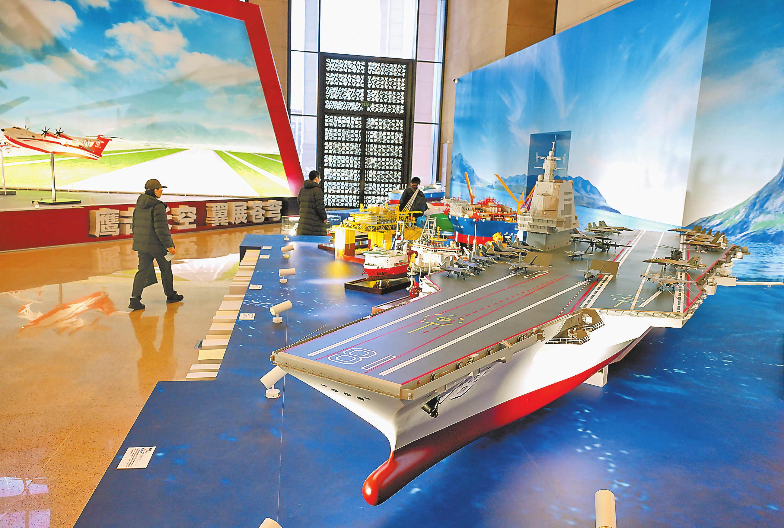 12月29日,“筑基强国路——中国制造‘十四五’成就展”在位于北京的中国国家博物馆开幕。展览通过高端制造、产业基础、智能制造、绿色制造、融合发展、美好生活等六部分、300余件(套)展品,全景呈现“十四五”期间中国制造蓬勃发展的历程,为公众直观呈现中国制造的硬核实力与民生温度。图为展出的福建舰模型。新华社记者 金良快 摄