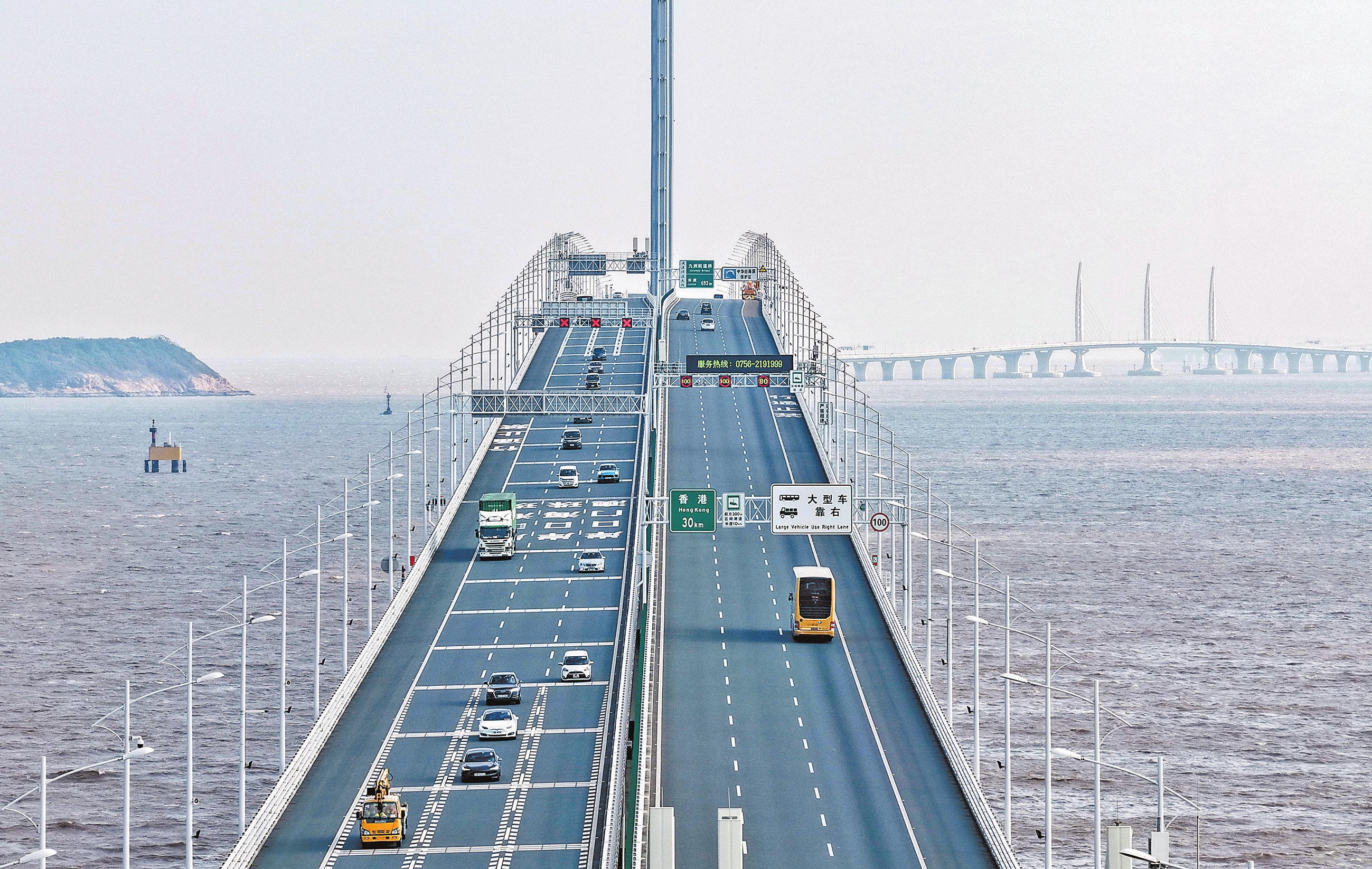 港珠澳大桥全长55公里,是世界最长的跨海大桥。2018年10月,大桥正式建成通车,香港到珠海、澳门的车程从3个小时缩短至约45分钟,大大缩短三地时空距离。随着“澳车北上”“港车北上”“粤车南下”等政策相继实施,大桥见证了粤港澳大湾区融合的加速度。图为1月6日拍摄的港珠澳大桥往来车辆。新华社记者 邓华 摄