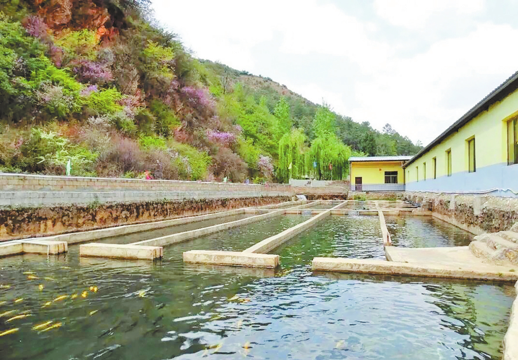 凤合镇合理村委会小河箐村拥有冷水资源优势,是昆明倘浩水产养殖有限公司早期建立的虹鳟鱼养殖基地所在地。该基地占地30亩,年产量超40吨,年产值达350万元。为放大资源优势,提升产品附加值,2025年在沪滇协作机制支持下,当地以该基地为核心,投入700万元实施了虹鳟鱼养殖中转储存项目。