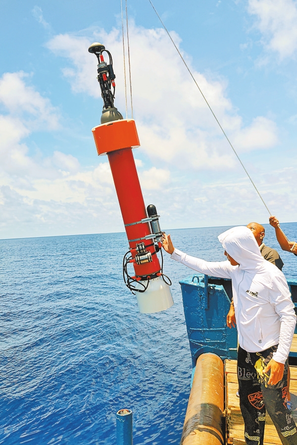 图为工作人员将海洋生物地球化学原位传感器搭载Argo浮标做海试布放(2025年5月15日摄)。