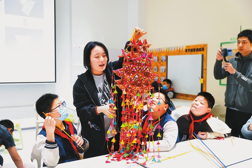 小朋友们了解菱角编制手工技艺。本报记者 高吴双 摄