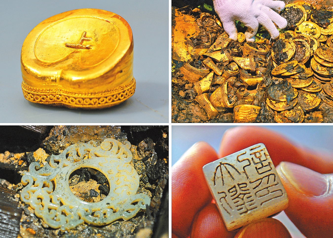 左上图:海昏侯墓出土的马蹄金(2015年11月24日摄);右上图:海昏侯墓主棺出土的金饼、马蹄金、麟趾金和金板(2015年12月24日摄);左下图:海昏侯墓出土的玉佩(2015年11月18日摄);右下图:海昏侯墓出土的玉印(2015年12月13日摄)。 新华社记者 万象 摄