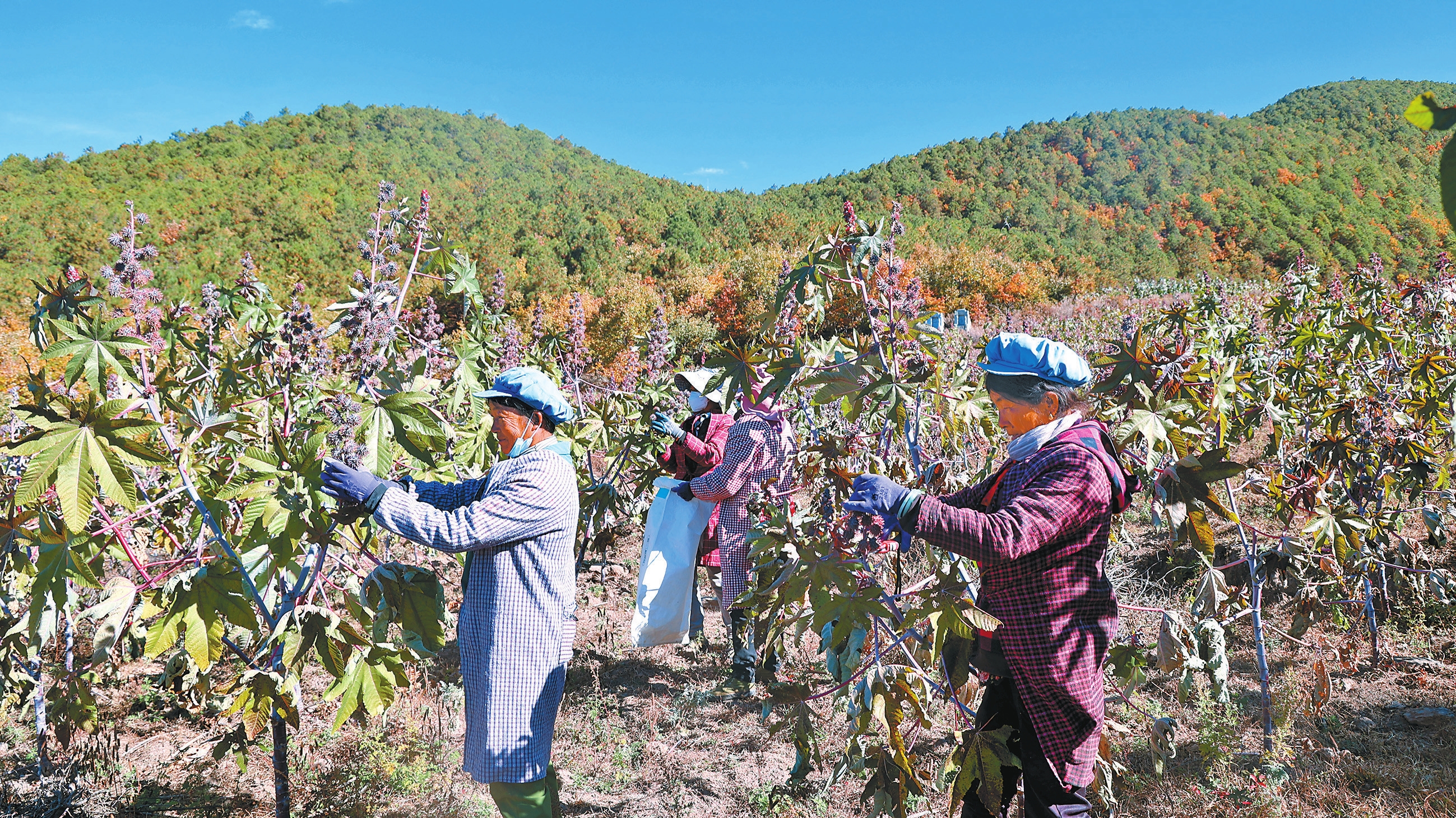 寒冬时节,兰坪白族普米族自治县营盘镇黄梅村的蓖麻种植基地里,连片的蓖麻秆壮叶茂,沉甸甸的蓖麻果挂满枝头。村民们穿梭其间娴熟采摘,昔日的荒坡地如今变成了增收田。