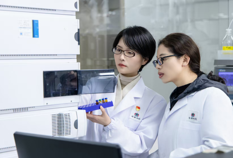 近年来,呈贡区依托优势人才资源,积极发展大健康生物医药产业。图为云南白药集团分析检测中心主任邓颖捷(左)与团队成员持续攻关,改进仪器性能。呈贡区融媒体中心供图