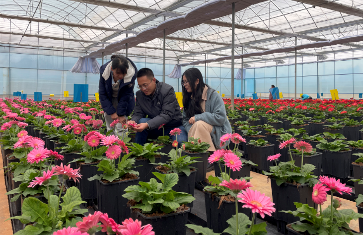 2024年7月,呈贡区携手云南省农业科学院建立“云南种子种业联合实验室—花卉生物育种实验室”,引进研究员李帆团队,攻克洋桔梗种业“卡脖子”难题。图为李帆(中)在花卉育苗基地查看种苗生长情况。受访者供图