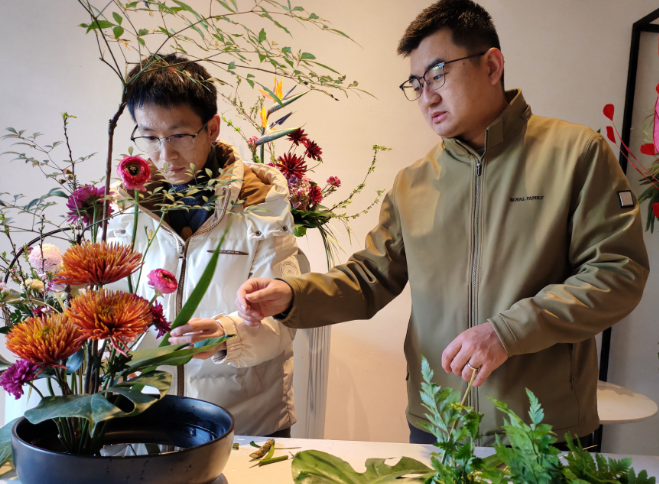 近年来,呈贡区围绕花卉产业加大职业技能培训力度,持续培育高技能人才,为产业迭代升级注入持久动能。图为“兴滇英才支持计划”首席技师潘建材(右)传授插花技艺,促进技能就业。 本报通讯员 毕云龙 摄