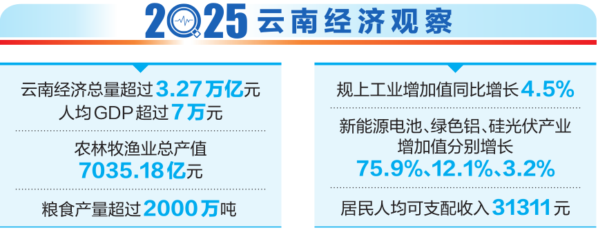 以数观形,以数察势。透视2025年云南经济成绩单,高质量发展的足迹愈发清晰:这一年,云南顶压前行、向新向优发展,交出了一份来之不易的成绩单,展现了行稳致远的韧性和活力,更彰显了破浪前行的决心和底气。