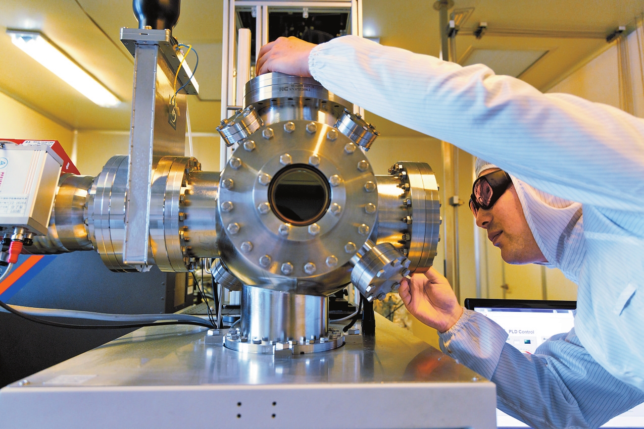 近日,中国科学院物理研究所团队成功在萤石结构铁电材料中发现一维带电畴壁,厚度和宽度均约为人类头发直径的数十万分之一,为开发具有极限密度的器件提供科学基础。相关论文成果已于北京时间1月23日凌晨在国际学术期刊《科学》发表。图为1月21日,在中国科学院物理研究所实验室,钟海博士后在做铁电薄膜沉积实验。 新华社记者 金立旺 摄