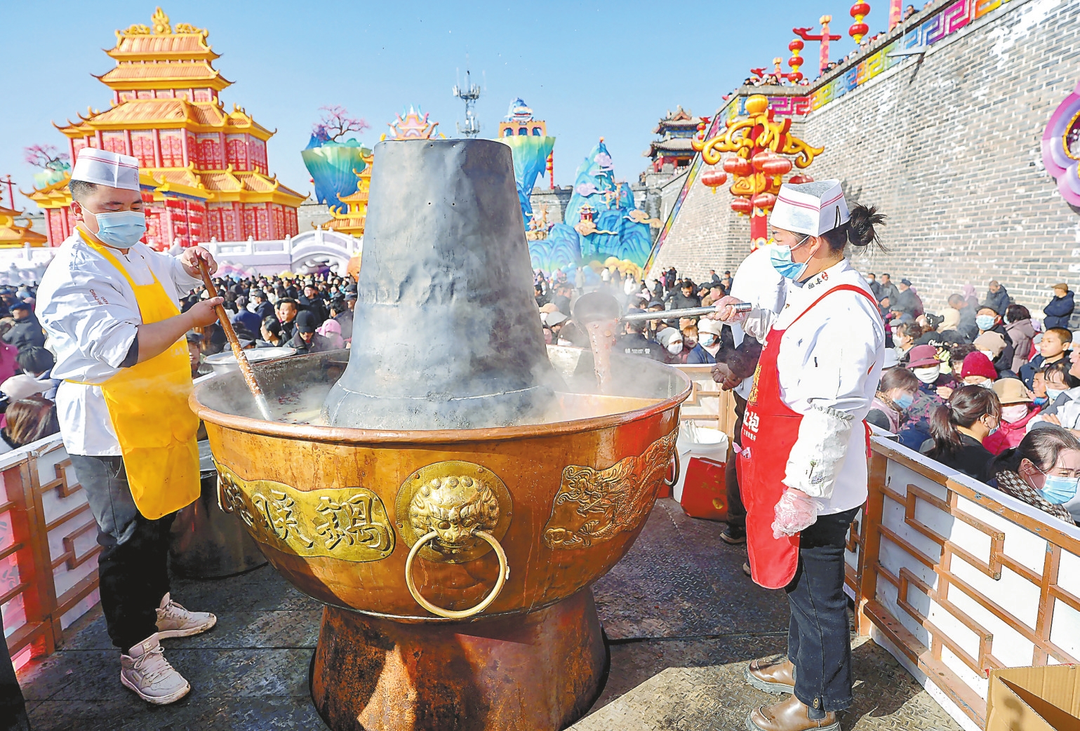 图为在宁夏固原市隆德县民俗文化节现场,工作人员熬制腊八粥。