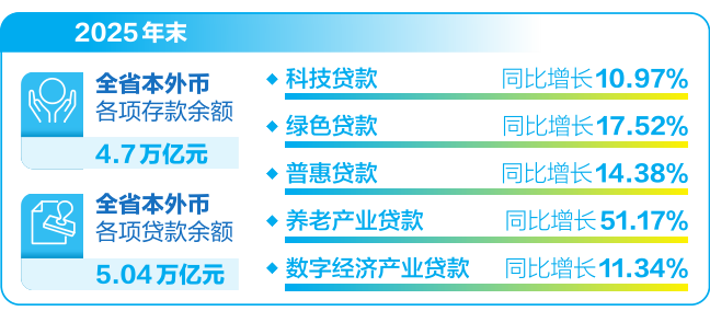 金融“五篇大文章”贷款总量快速增长。2025年末,全省金融“五篇大文章”贷款余额1.81万亿元,同比增长13.26%。其中,科技贷款同比增长10.97%,绿色贷款同比增长17.52%,普惠贷款同比增长14.38%,养老产业贷款同比增长51.17%,数字经济产业贷款同比增长11.34%,均高于各项贷款增速。