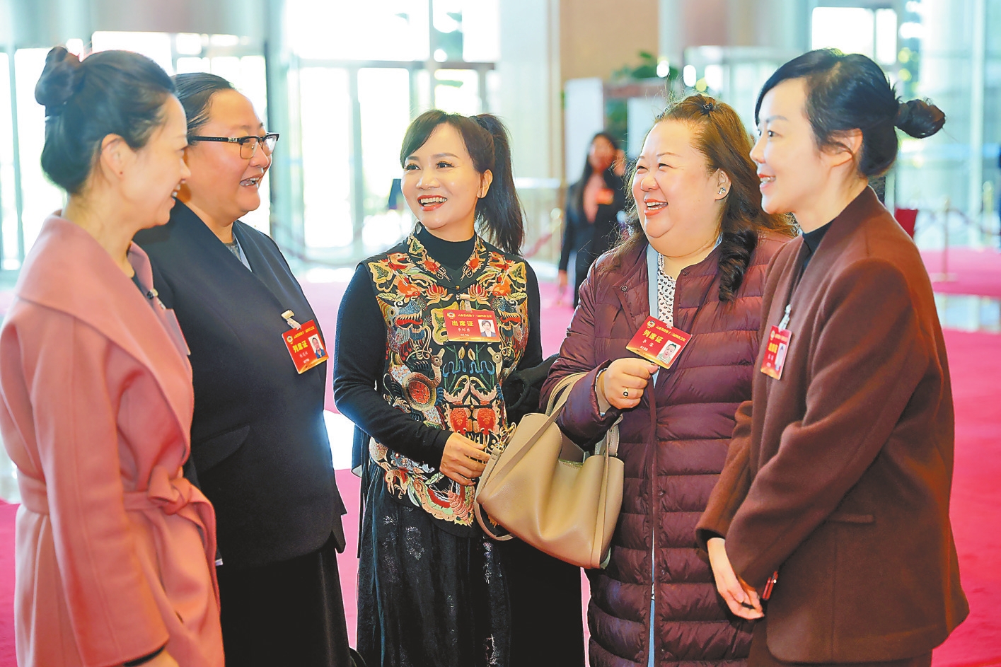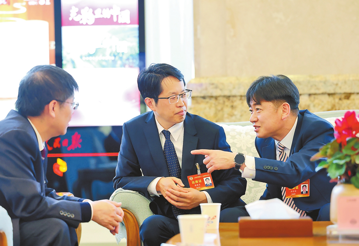 政协委员在会议间隙交流心得。本报记者 周灿 顾彬 胡妤雅 高吴双 摄