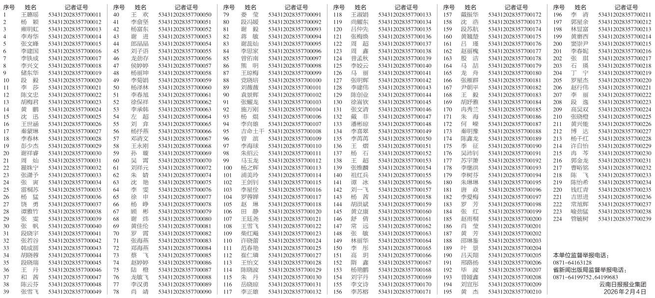 根据《云南省新闻出版局关于开展2025年度新闻记者证核验工作的通知》(云新出通〔2026〕3号)要求,我单位已对持有新闻记者证人员进行审核,现将拟通过核验人员名单进行公示(按新闻记者证编号由小至大顺序排列)。