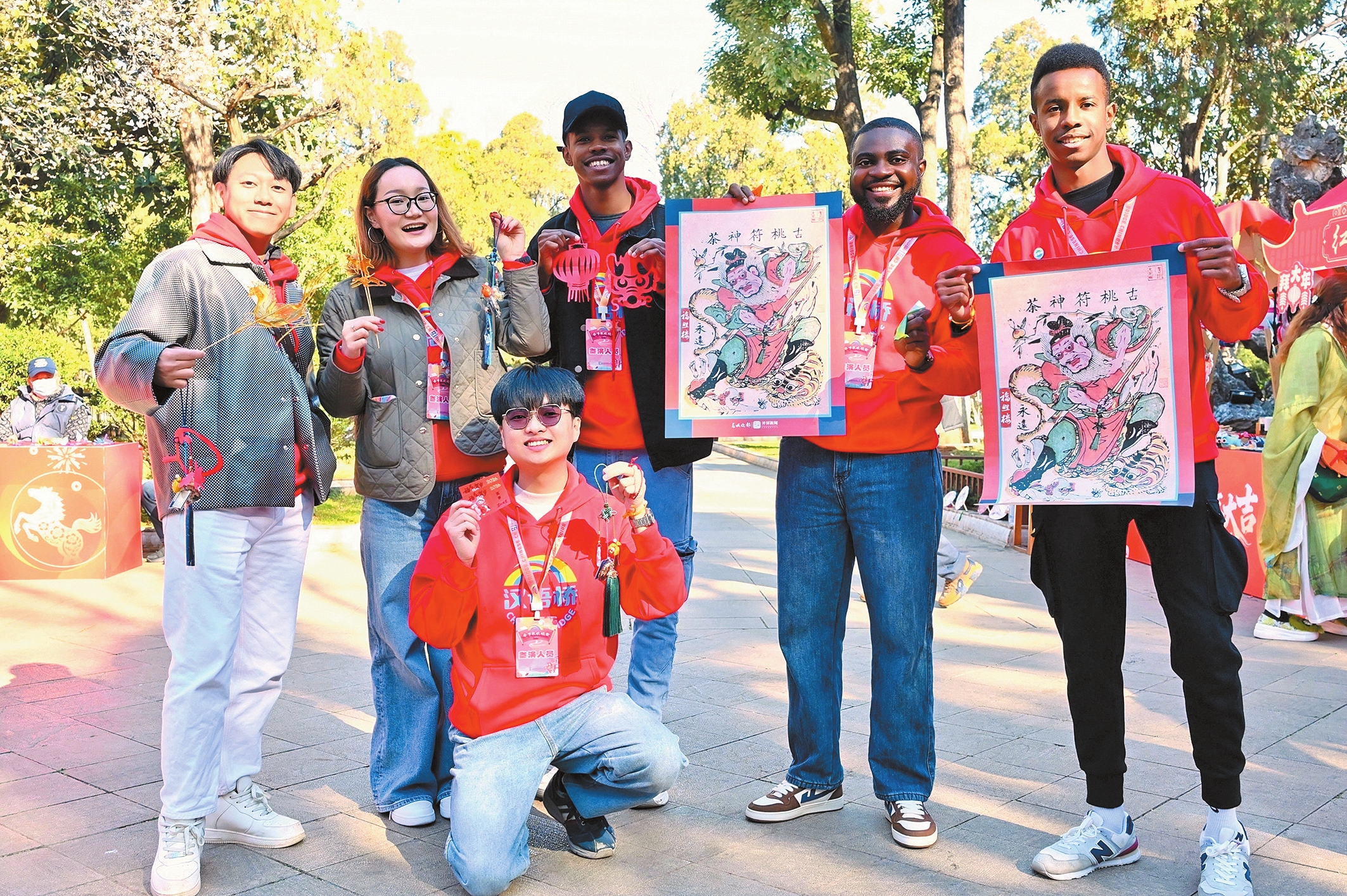 清晨的大观公园,早已被浓浓的年味和欢声笑语填满。长联名楼之下,不同肤色的青年们提笔挥毫,一个个“福”字、一副副春联依次诞生;指尖翻飞间,红纸化作灵动的窗花、吉祥的锦鲤。糖画的甜香、漆扇的雅致、中国结的巧妙,每一项体验都让春节变得可触可感。猜灯谜区里,围着谜面思索的世界青年们,用流利的中文热烈讨论。人鸥共舞的灵动景象,与汉风吟诵的悠长韵味交织,构成一幅中外友人共迎新春的温暖图景。