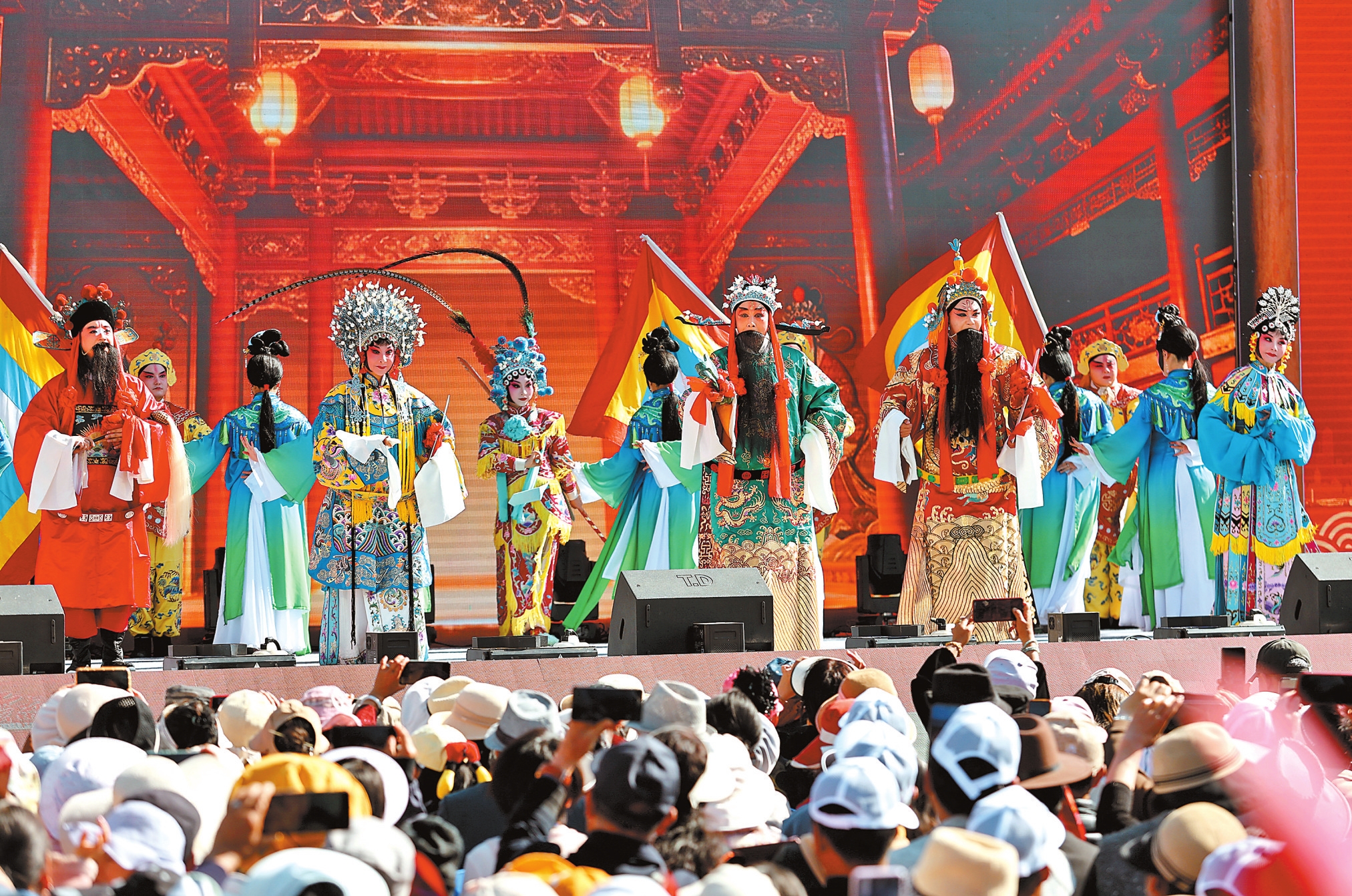 2月10日,“魅力安宁·百年滇秀”2026年全国“四季村晚”(春节村晚)示范展示活动在安宁市县街街道石庄村举行。云南省滇剧院表演了《杨门女将》《荷花配》等经典剧目,现场还专设滇剧主题乡村市集,集中展销融入滇剧元素的鲜花饼、甲马年画、扎染文创及八街玫瑰制品等,并推出“滇剧十宴”民俗美食体验。图为《群仙贺岁》剧目表演。本报记者 陈飞 黄兴能 摄