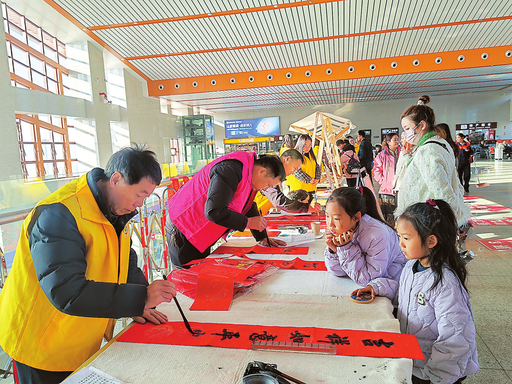 上午9时30分,二楼候客厅歌舞快闪跃动,喜庆旋律驱散疲惫,旅客驻足拍照、喝彩连连。新春送福区红纸翻飞,书法家挥毫写就“出入平安”“新春快乐”等春联、“福”字,墨香裹着祝福直抵人心。来自湖北荆州的“云南女婿”邹大晴与妻子一家边选春联,边感言:“这副春联写出了我对第二故乡的深情。”