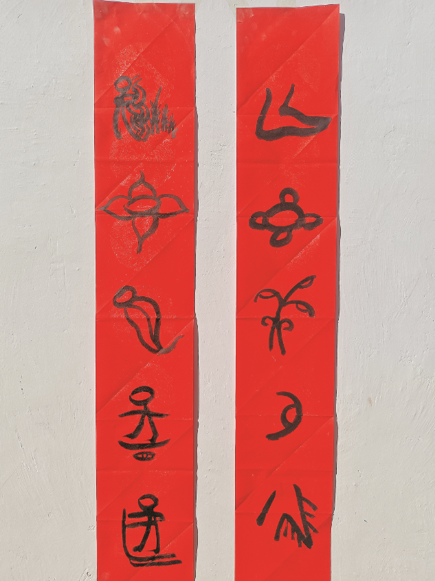 纳西人常说“达瓦纳西努”——一句古老的谚语,字面意思是“腊月里的纳西人像疯了一样忙”,内里却描绘着一种深植于时序与仪轨的庄严忙碌。在这样的忙碌中,以东巴象形文字书写楹联,成为连接世俗与精神、个体与传统的关键仪式。诸多楹联中,流传最广的莫过于这一副:“根壮树不倒,林茂水长流。”寥寥数字,却不止于年节的装饰。它是纳西人将生活感悟、自然敬畏与家族祈愿,凝于笔端的温暖寄托。墨迹在冬阳下静默闪烁,一个民族穿越千年的文脉,便在这书写与凝视之间,悄然延续。