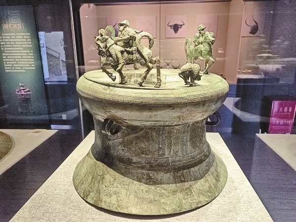 讲解员介绍,铜鼓先铸后加骑士:鼓体用铜锡合金范模法,骑士以铜锡铅三元合金失蜡法铸造。其为古滇国祭祀重器,或为滇西昆明人战利品;骑士腰悬1米长剑(区别于古滇短剑),英武非凡,现成为古滇人英勇精神的具象化载体,兼具极高审美与艺术价值。