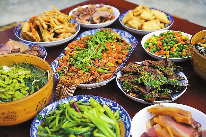 一桌团圆饭,道道有讲究。酸辣鱼保留完整头尾,搭配番茄、小米辣与阿佤芫荽,酸香鲜辣,寓意有头有尾、年年有余;茴香豆米汤绵密清香,“茴”谐音“回”,寄托着家人盼游子归来的心愿;豌豆炒玉米和胡萝卜丁色泽鲜亮,金黄翠绿相映,寓意金玉满堂;本地石磨豆腐煎至两面金黄,外酥里嫩,寄意新的一年福气满满;旺火快炒的青菜脆嫩鲜亮,寓意日子生机勃勃。“我最喜欢豌豆炒玉米和胡萝卜丁,颜色好看,吃起来甜甜的。”村民张梓璇说。